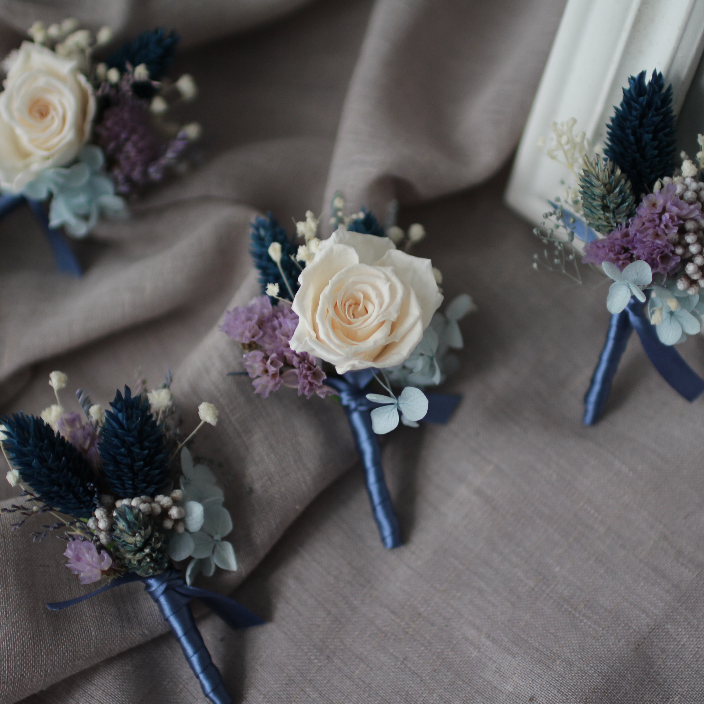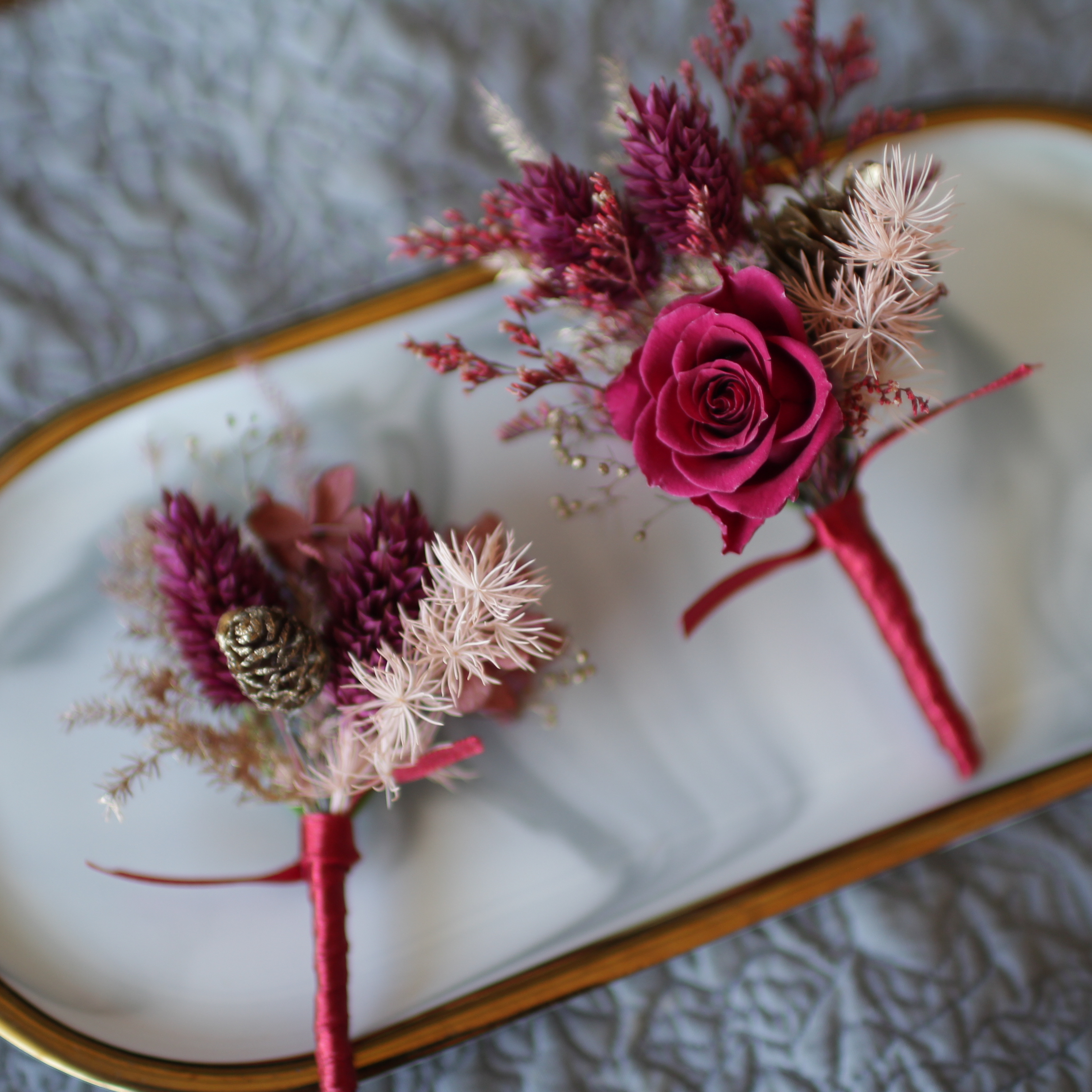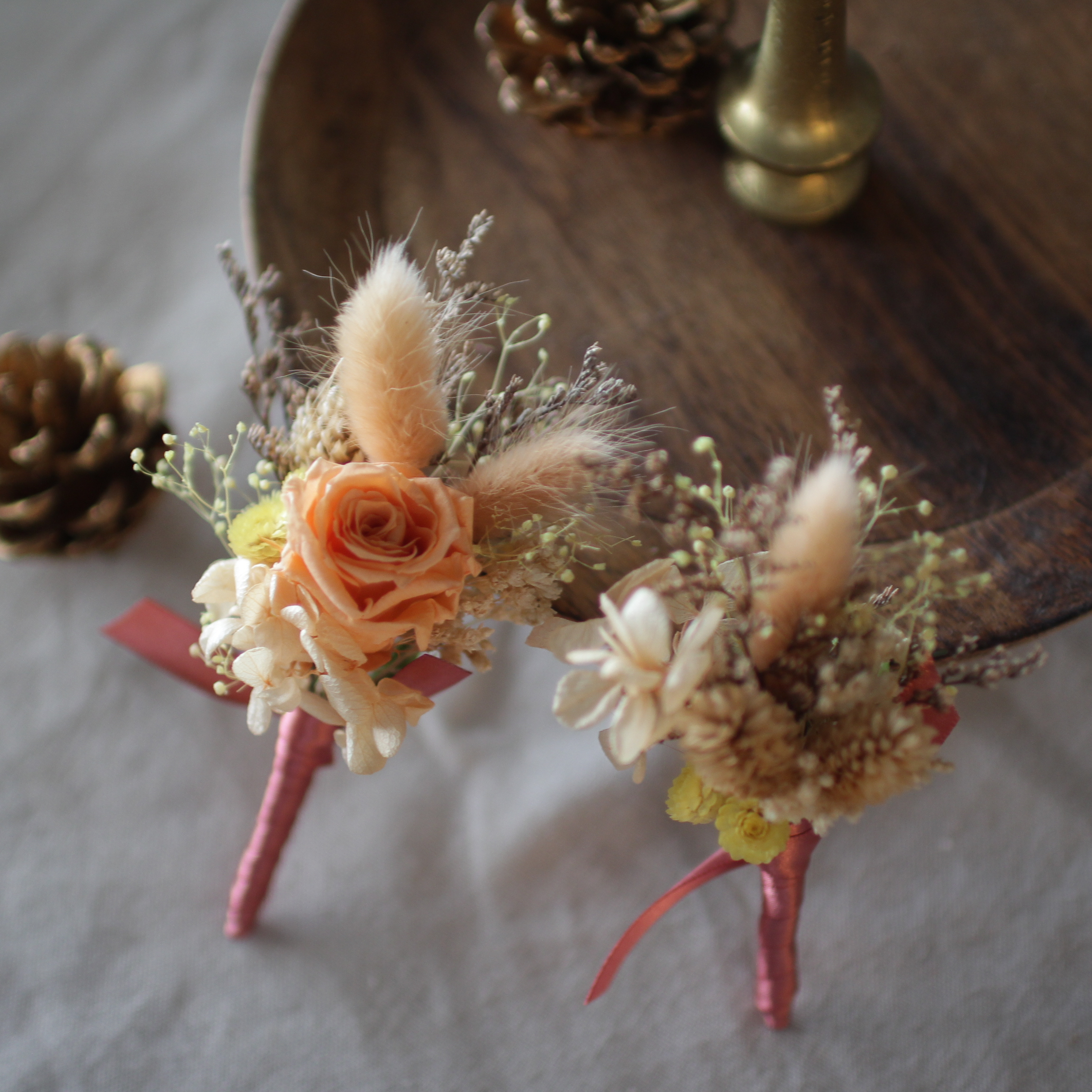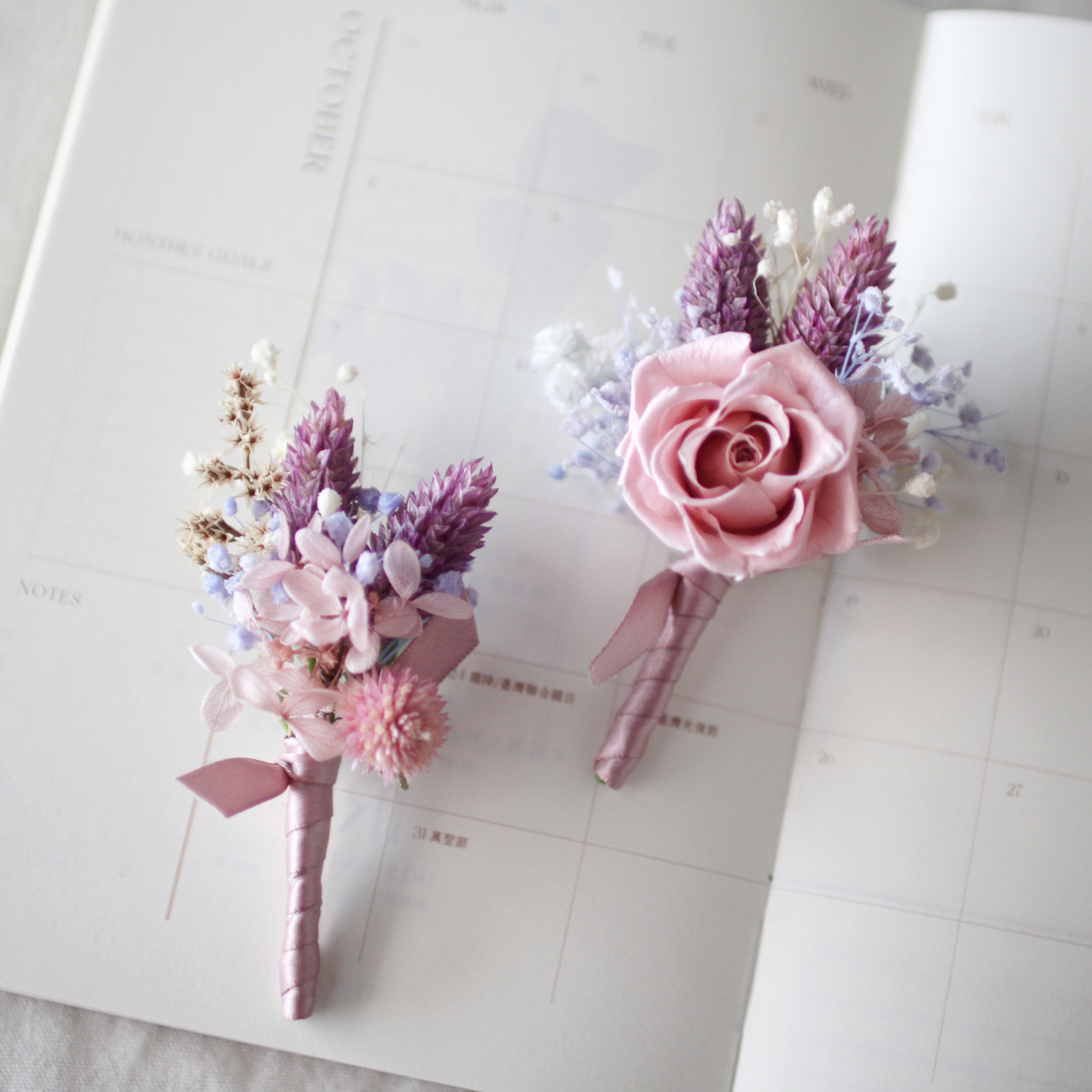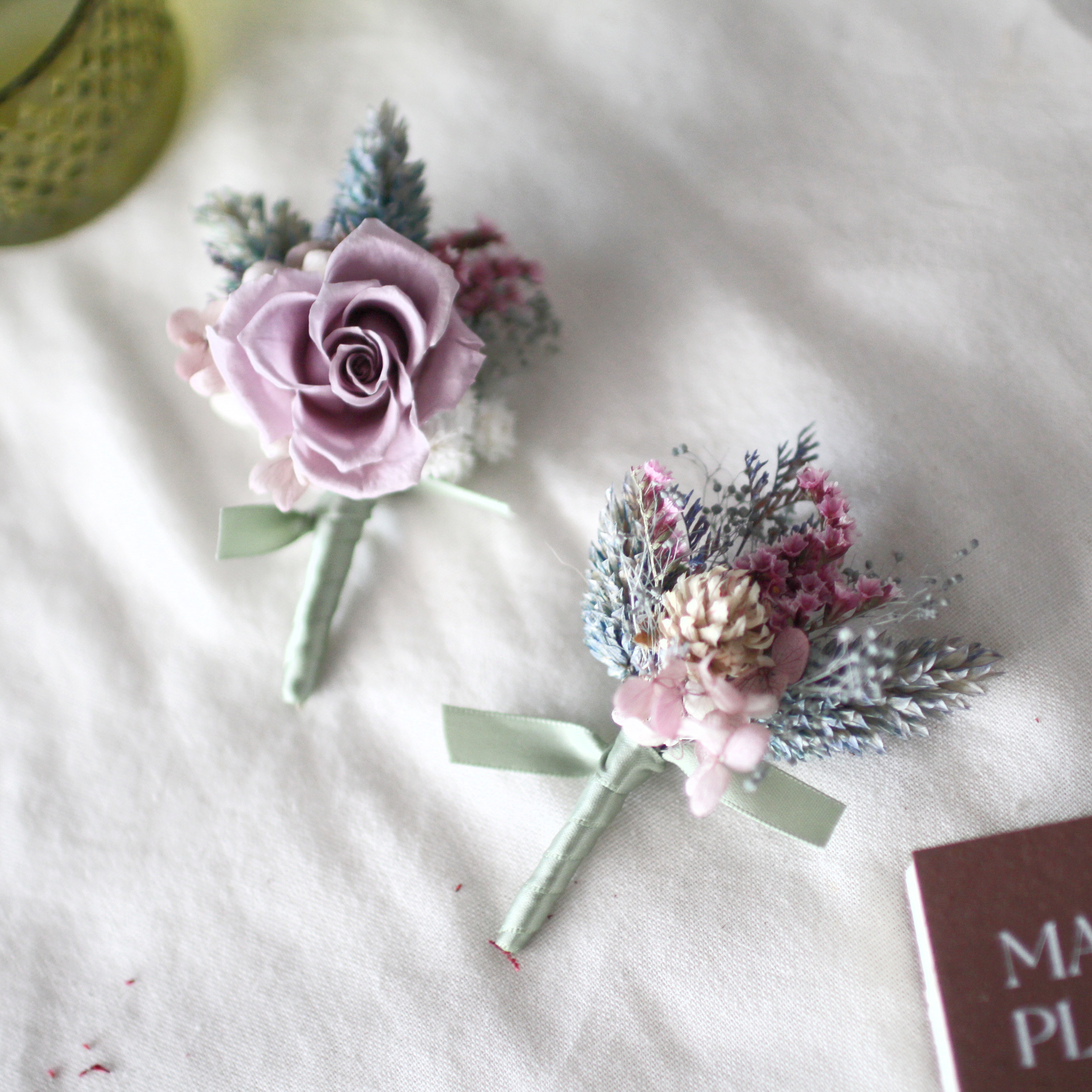 胸花可說是新人在準備婚禮時,替重要的父母與摯友們挑選的貼心小禮。除了傳統的鮮花胸花之外,永生花胸花也是另一種選擇——既可適應台灣炎熱的天氣(讓花朵不會因為一整天沒吃水而變軟變蹋),還可以保存下來留作紀念,再次裝飾在草帽、圍巾等等。在台灣,有些長輩會在意花材使用上的意象,比如排斥假花、人造花等,認為是虛情假意的意思;而永生花則是經過加工處理的「真花」(點這邊認識永生花),既有新鮮感,也不用擔心長輩觀感不好。