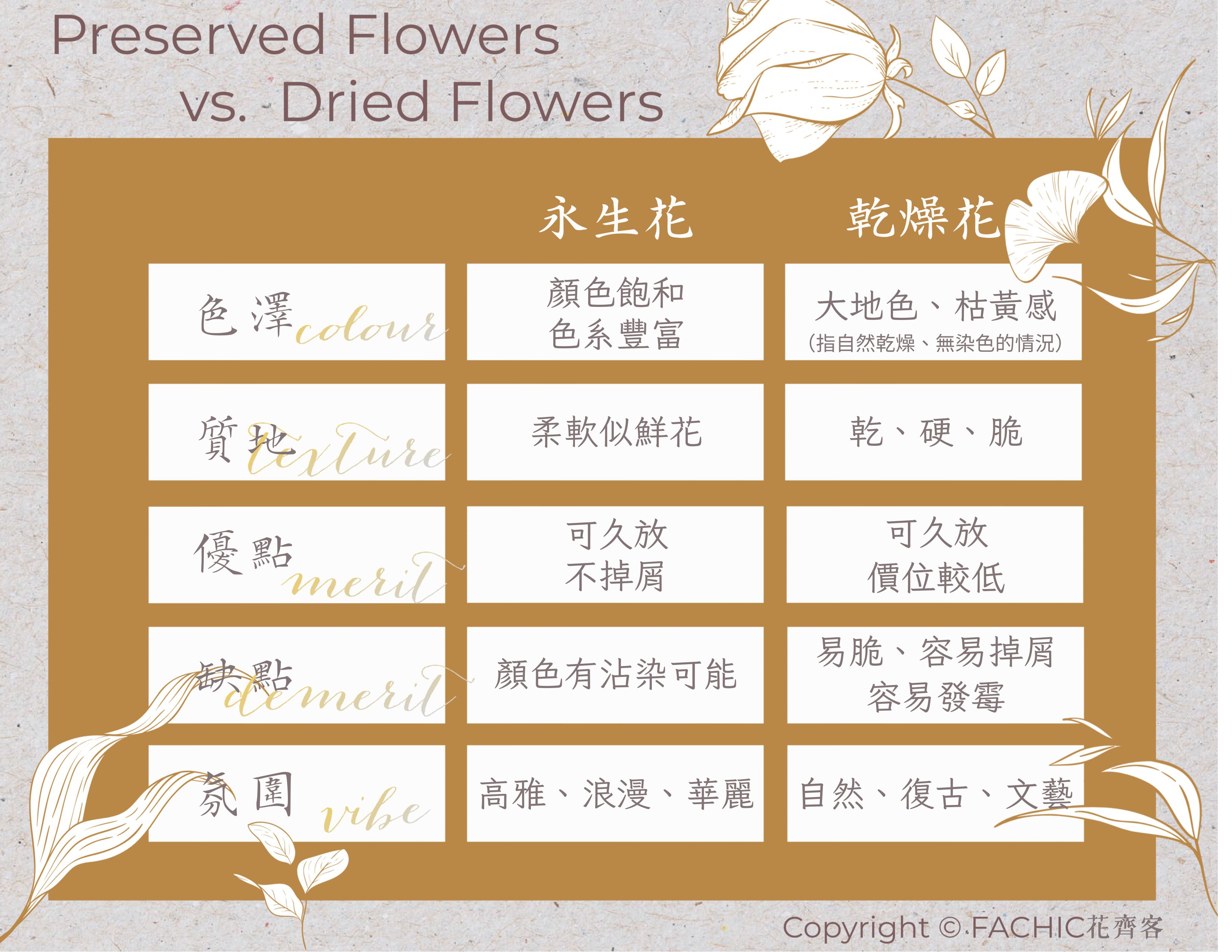 整體看來,相較於乾燥花,永生花的飽和色系、質感氛圍更適用於婚禮、生日、各種紀念日等等,或純粹只是想要送給重要的人,傳遞彼此珍惜、保存情誼的一份心意。永生花也可說是調劑現代人忙碌生活的一個最佳解決方案,尤其對於收到鮮花卻不知道怎麼照護、常常沒有換水而直接放到發臭的多數民眾來說,既可妝點生活、有紀念價值、又不需花費時間維護。以後若有送禮需求,不妨和FACHIC的花藝師一起討論,好好為對方客製一份適合他/她的永生花商品!(這裡看FACHIC永生花客製商品)